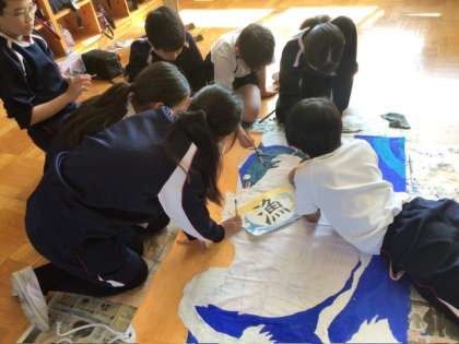 休み時間を使って、旗の制作や応援の言葉づくりに取り組んでいます。仲間と協力しながら、当日に向けて着々と準備を進めています。