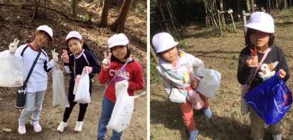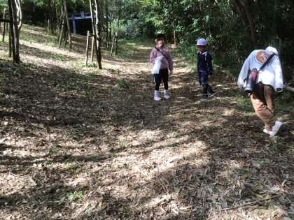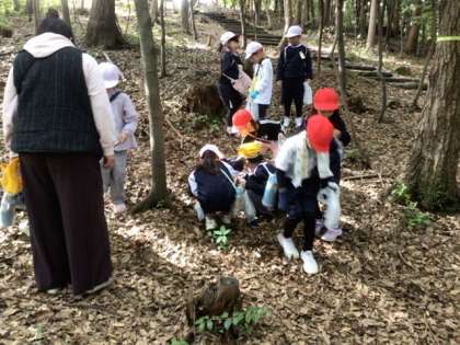 生活科「ようこそ あきの テーマパークへ」の学習で、まごころの森へ出かけました。子どもたちは、落ち葉や木の実など秋の自然素材を使って、作品づくりに挑戦します。