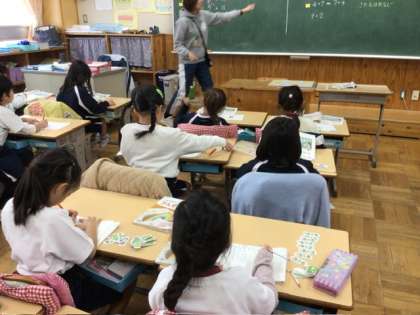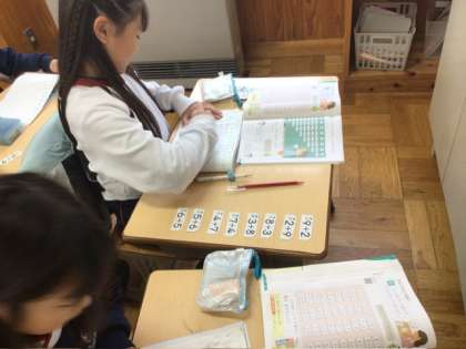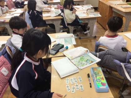 算数の授業では、たし算カードを使って「答えが11になる式」を探す活動に取り組みました。繰り上がりの計算の復習にもなっています。