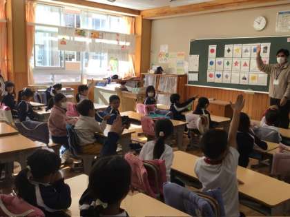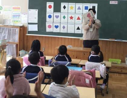 外国語に親しむ学習の一環として、ALTと一緒に楽しく活動を行いました。黒板に掲示された色や形のカードの中から、ALTが1枚を隠し、子どもたちはそのカードが何かを英語で答えるゲームに挑戦しました。