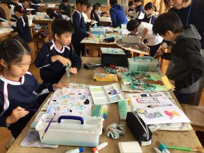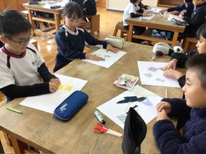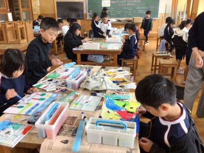 図画工作の時間に「ぬのでえがくと」の学習をしました。子どもたちは、お気に入りの布を自由に並べたり重ねたりしながら、思いついたことを表現していました。色や形、手ざわりを楽しみながら活動していました。
