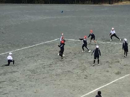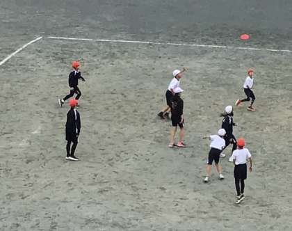体育の授業で「アルティメット」に取り組みました。アルティメットは、バスケットボールやサッカーのようなゴール型のゲームで、フリスビーのような円盤を味方同士でパスしながら、得点を目指します。子どもたちは、チームで声をかけ合い、作戦を立てながら楽しく活動していました。
