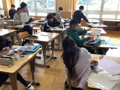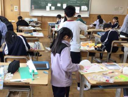 図画工作科の授業で「幸せを運ぶカード」に取り組んでいます。いよいよ完成間近となり、子どもたちは手渡す相手のことを思い浮かべながら、心を込めて仕上げていました。