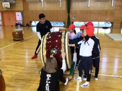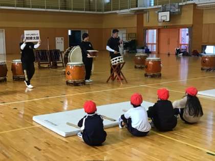 松平わ太鼓の先生を講師にお迎えし、和太鼓体験を行いました。迫力ある太鼓の実演や分かりやすい説明に続き、子どもたちは拍子に合わせて挑戦し、和太鼓の魅力を全身で感じることができました。日本の伝統文化に触れる貴重な機会となりました。