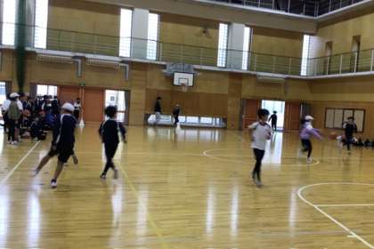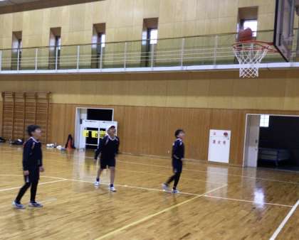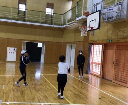 体育ではバスケットボールの学習に取り組みました 3人でパスを素早く回しながら、シュートの練習を行いました。
