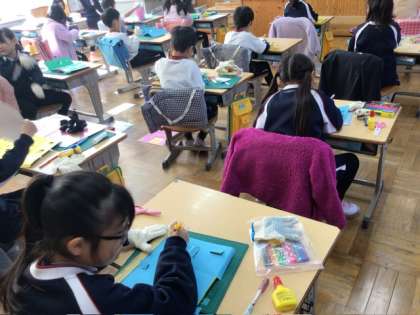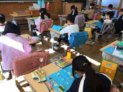 図画工作科では「まどをあけたら」の学習を行いました。カッターナイフの安全な使い方を学び、いよいよ窓のある建物づくりに挑戦です。子どもたちは、紙を切り抜いて窓を作る活動に取り組んでいました。