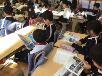 国語の時間に「のりものカードをつくろう」という学習を行いました。今日は、本の中から好きな乗り物を選んでいました。名前・役目・つくりなどを調べてカードにまとめていきます。