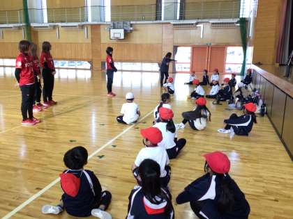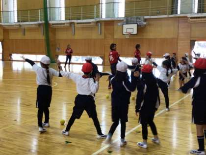 トヨタレッドテリアーズの皆さんを講師にお迎えし、投げ方教室を開催しました。ソフトボールをバトン代わりに使ったリレー形式の運動で体をほぐし、その後はボールを遠くに投げるためのコツを、ポイントを押さえて丁寧に教えていただきました。