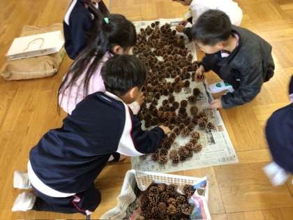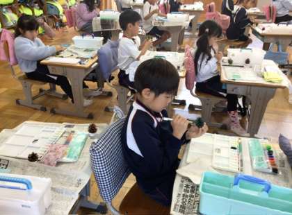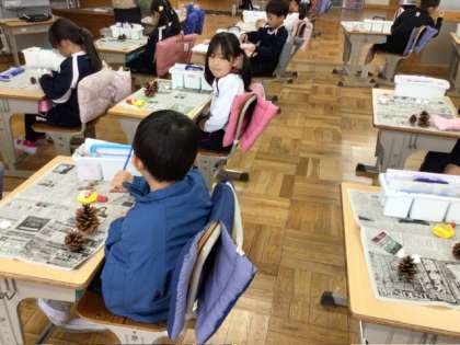 保護者の方からいただいた松ぼっくりを使って、クリスマスツリーづくりに取り組みました。好きな色を塗りながら仕上げていきます。季節にぴったりの、素敵なツリーができそうです。