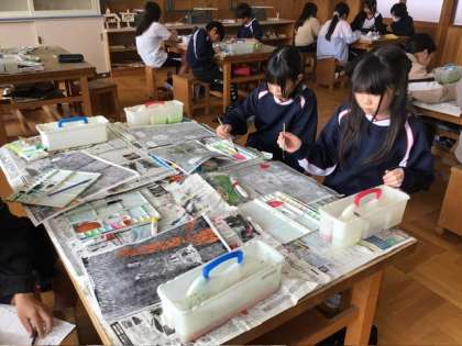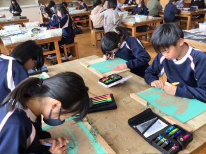 図画工作科では、版画の学習に取り組みました。子どもたちは生き物を題材に、細かな部分まで丁寧に彫り進め、自分だけの版を完成させました。刷り上がった作品には絵の具で色を重ねていきます。