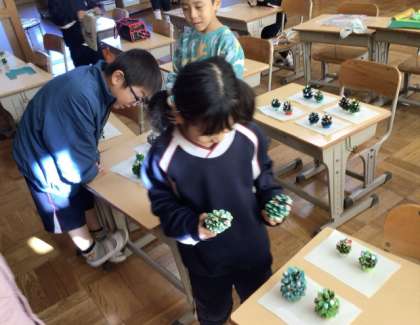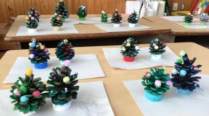 松ぼっくりで作ったクリスマスツリーに、飾りつけを行いました。私は、色を塗っただけで完成だと思っていましたが、さらに飾りをつけることで、ぐっと華やかに仕上がりました。子どもたちは完成したツリーをうれしそうに見せてくれました。