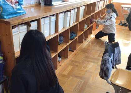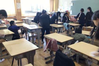 6年生も、教室の清掃に取り組んでいました。新しい年を気持ちよく迎えられるよう、いつも以上に机や床、棚の中まできれいにしていました。これまでに、どの学年も計画的に清掃箇所を分担しながら、新年に向けて教室を整える活動を進めてきました。