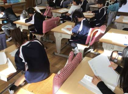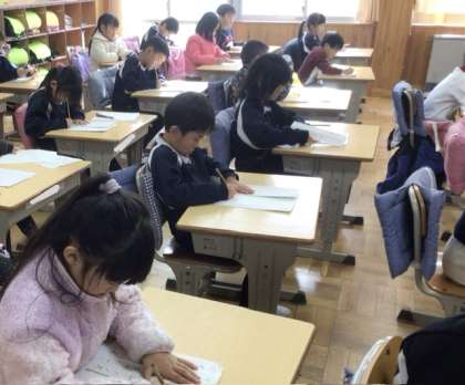 毎年恒例の書き初め大会が行われました。全校児童の集中する気持ちが伝わるように、しんと静まり返り、どの子も真剣な表情で取り組んでいました。