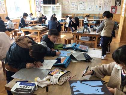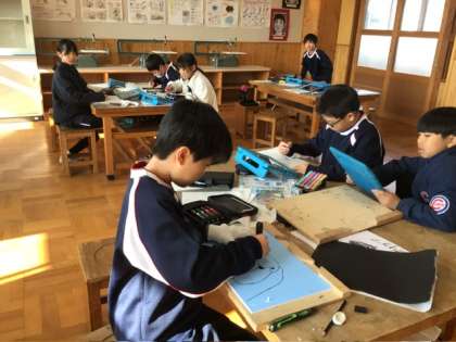 図画工作科の学習で、版画の制作が始まりました。子どもたちは下絵を描きながら、どの部分を残し、どのように彫り進めていくかをじっくり考えて取り組んでいました。中には、彫り作業に入る子もいました。
