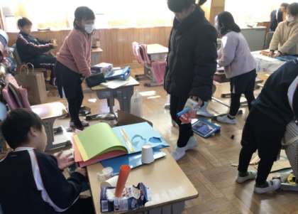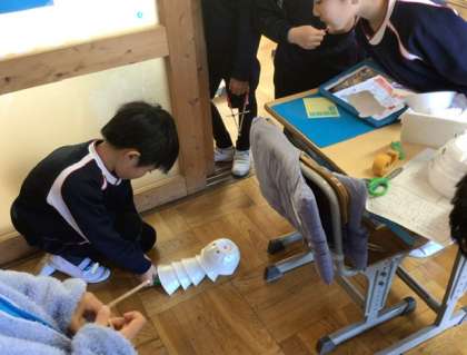 生活科「楽しさひろがれ わたしのおもちゃ」の学習の様子です。 子どもたちは、自分で立てた計画をもとに、おもちゃづくりに取り組んでいました。材料を工夫し、思い思いのアイデアを形にしていました。