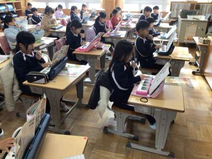 音楽の時間に、鍵盤ハーモニカの演奏に挑戦しました。曲は「小ぎつね」で、子どもたちにとって今日は初めての演奏でした。指使いに気を付けながら、一生懸命取り組んでいました。