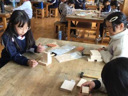 子どもたちは金づちの持ち方や打ち方を確かめながら、木材にくぎをトントンと打ち込んでいました。