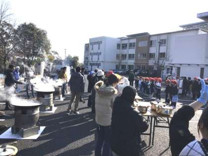 なわとび大会の合間には、豚汁の準備の様子を見学させていただきました。