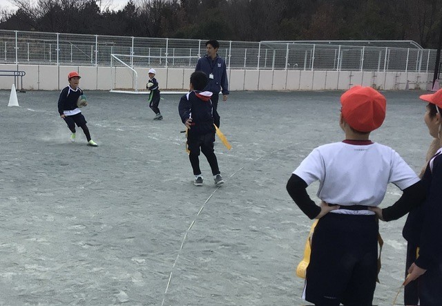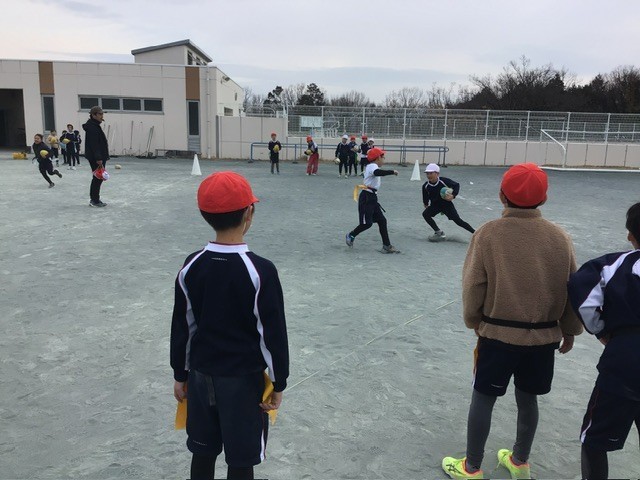 体育ではタグラグビーに取り組みました。腰に付けたタグを相手に取られないように、ボールを持って動く練習をしました。相手の動きをよく見ながら、素早く判断して動く姿が見られました。