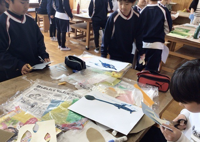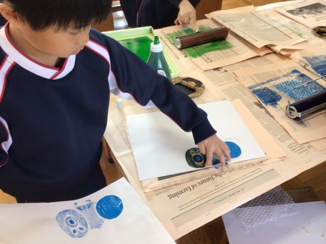 図画工作科「いろいろうつして」の学習では、版が完成した子からインクを付けて刷りの作業に取り組みました。