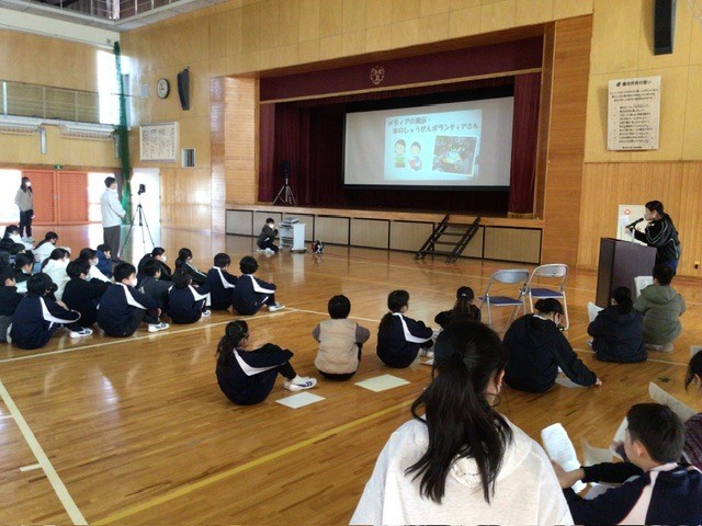 本日の全校集会はオンラインで行いました。体育館には、6年生と表彰受賞者が集まり、他の学年は教室から参加しました。