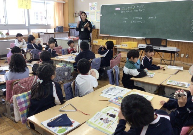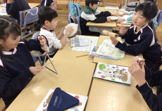 音楽の授業で、気に入った打楽器の音を見つけ、歌に合わせて鳴らす活動を行いました。鈴やトライアングル、タンブリンなど、楽器の音を順番に試しながら、子どもたちは楽しそうにリズムを合わせていました。