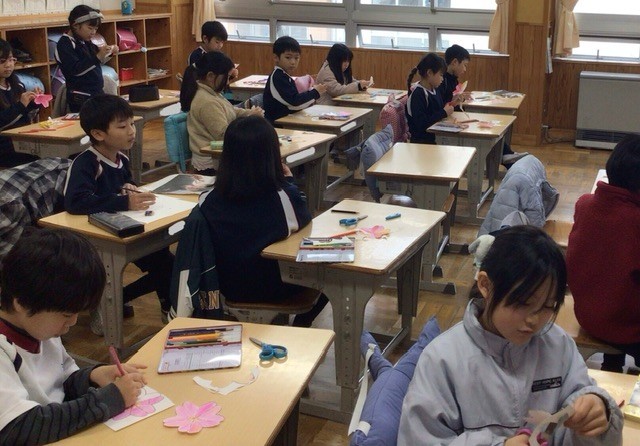 6年生を送る会に向けて、飾りづくりに取り組みました。色を丁寧に塗り、桜の形に切り取り、折って立体的に仕上げるなど、細かな作業にも一生懸命取り組む姿が見られました。