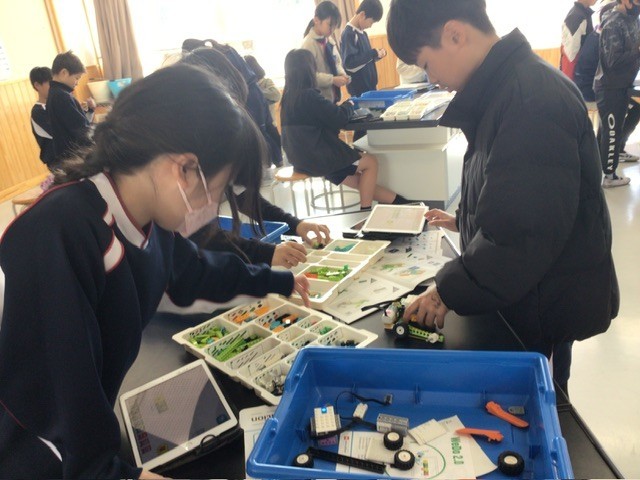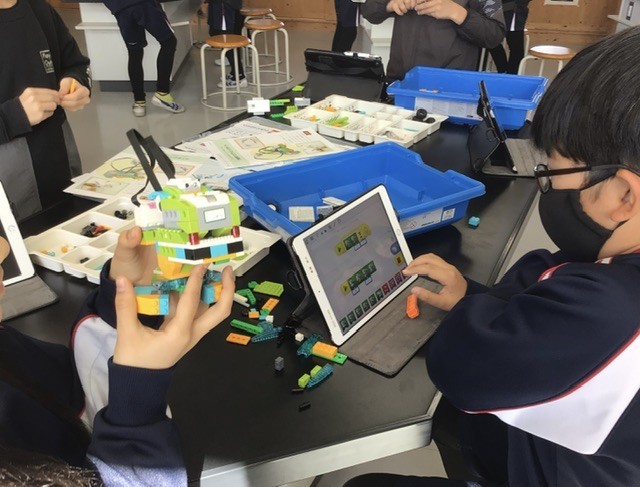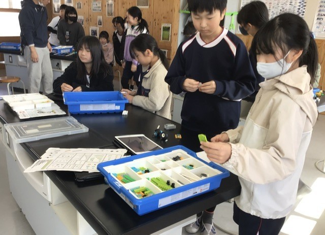 理科では、プログラミング学習としてスイッチロボットを組み立てました。回路をつなぎ、命令ボタンを押すとロボットが思い通りに動き、子どもたちは楽しそうに操作していました。