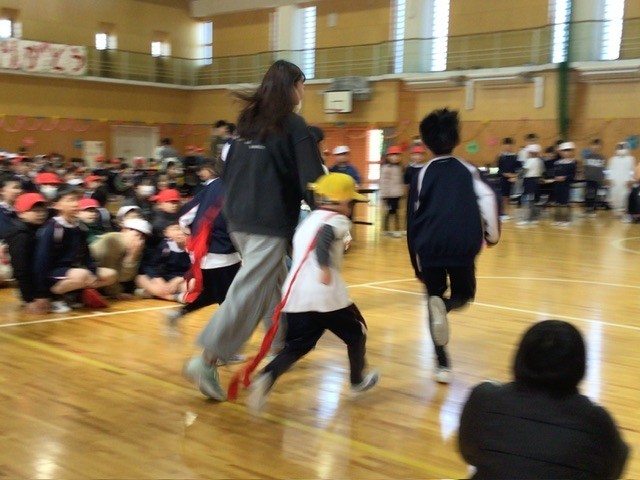 1,2年生と6年生のゲーム、借り物競争と寸劇、クイズ大会の様子です。