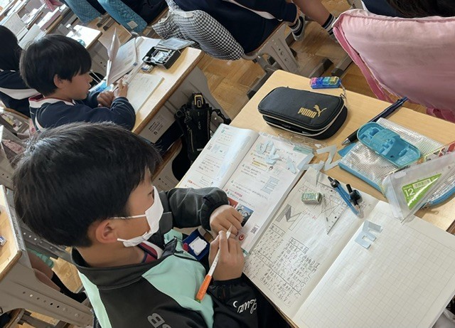 算数の時間に「対称な図形」について学習しました。 子どもたちは、図形を「2つに折ると重なる」という性質に注目しながら、どの点とどの点が対応しているのか、どの直線が対称の軸になるのかを丁寧に調べていました。