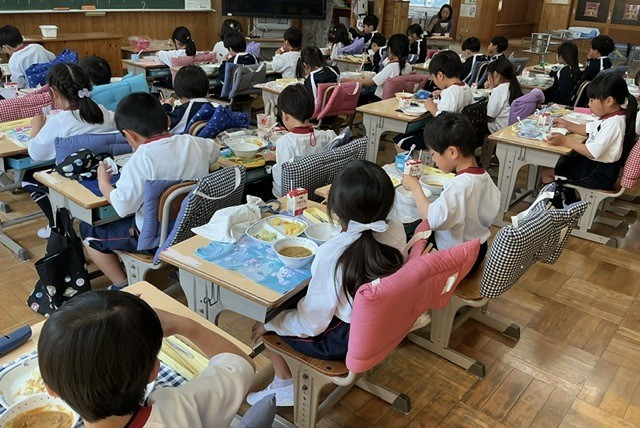 小学校での給食2日目。給食当番が配膳し、みんなでそろっておいしそうにいただきました。