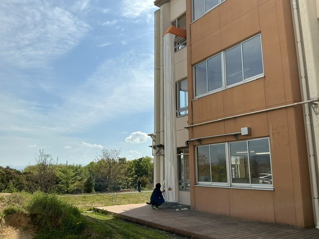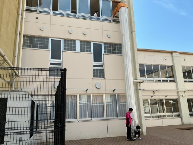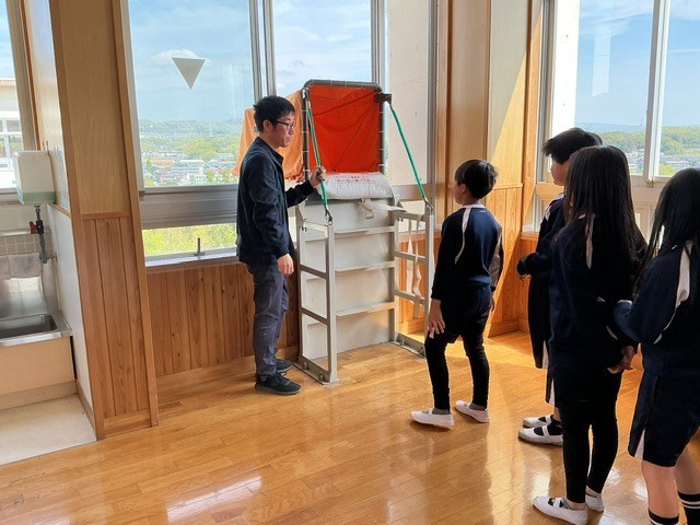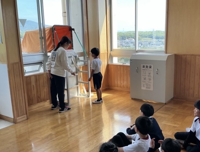 3階の教室で生活する4〜6年生は、救助袋を使った避難訓練にも取り組みました。いざという時に安全に避難できるよう、真剣に訓練する姿が見られました。