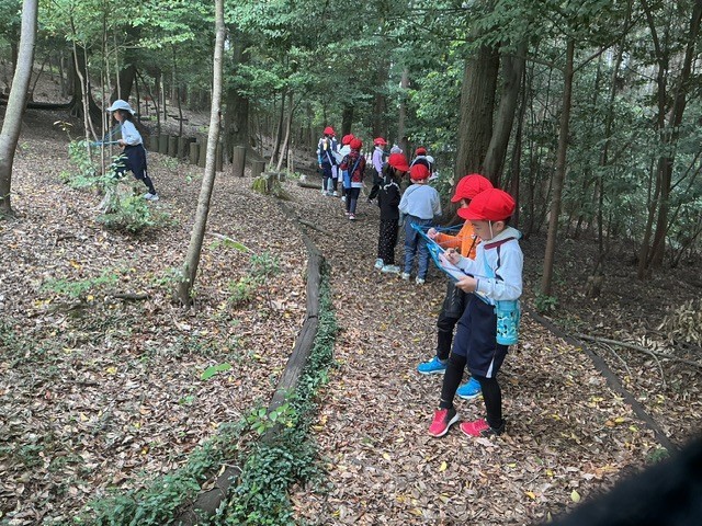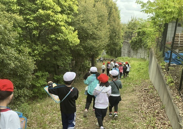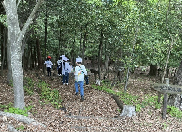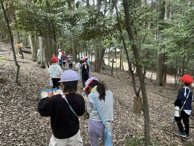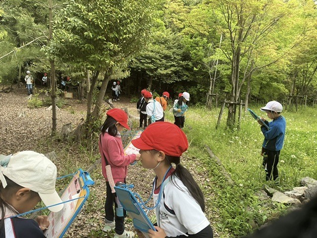 生活科の時間に、まごころの森へ春みつけに出かけました。ビンゴカードのようなワークシートに、白いものや黄色いもの、つるつるしたものなどを見つけて書き込みながら、森の中で見たり触れたりする時間を楽しみました。