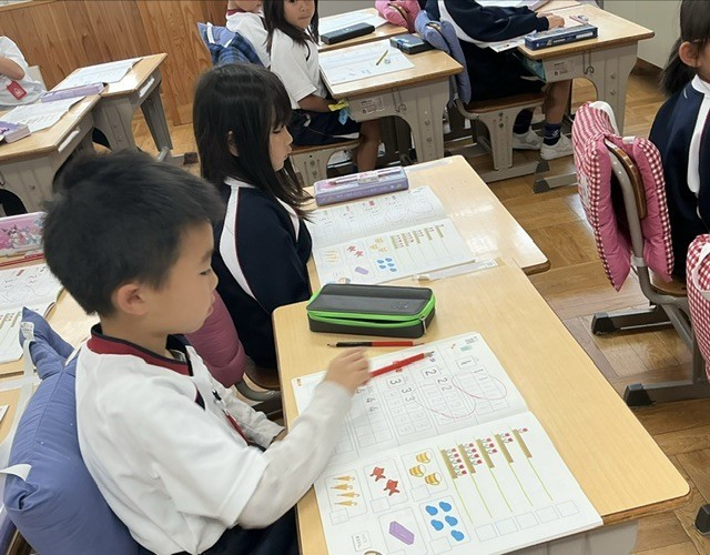 算数で、身のまわりのものを数えたり、数字で表したりする学習をしました。子どもたちはお手本をよく見ながら、丁寧に練習に取り組んでいました。