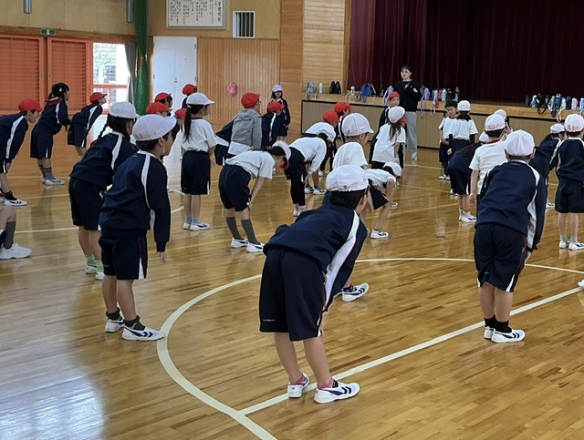 体育係の号令に合わせて準備運動を行いました。前回よりも号令の声がはっきりと大きくなり、みんなで気持ちよく運動を始めることができました。
