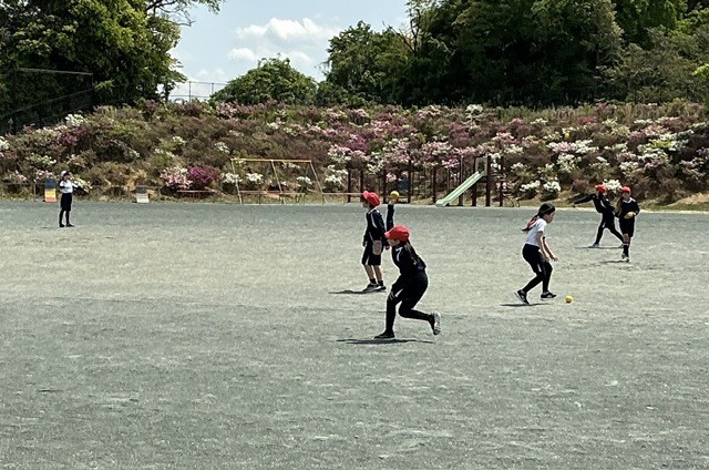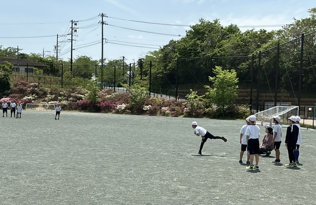 体育の時間に、ソフトボール投げに挑戦しました。子どもたちは足の運び方や腕の振り方を意識しながら、一生懸命に投げる練習に取り組んでいました。