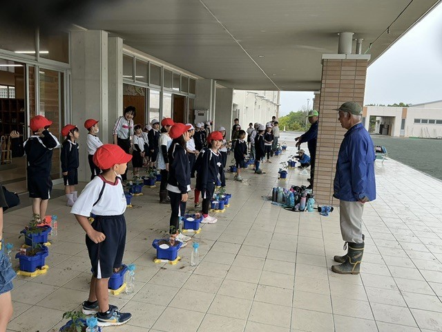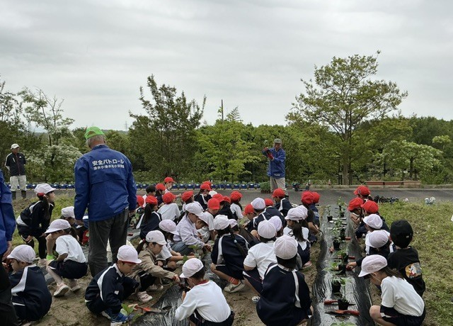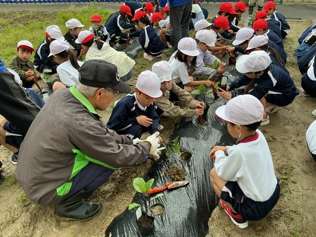 畑ボランティアさんのお力をお借りして、野菜の苗を植えました。畑には3種類の野菜を植え、一人一鉢としてミニトマトの苗も丁寧に植え付けました。これからの成長が楽しみで、収穫の日が待ち遠しくなりました。