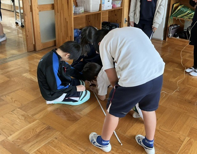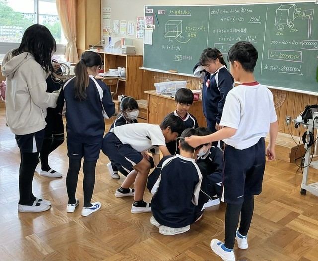 算数で体積の学習をしました。今日は1㎥の大きさを、紙のひごを使ってグループで形づくりました。辺の本数を考えながら協力して作り、体積の大きさを実感していました。
