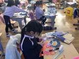 図画工作科「未来のわたし」の学習の様子です。作品に色付けし、いよいよ完成のよう...