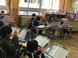 2年生の音楽の授業です。「アイアイ」の曲を歌いながら、リズム打ちを楽しそうにし...