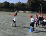 体育の授業でボールけり遊びをしました。コーンを回って次の子と交代する練習を行い...