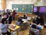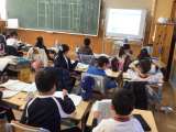 5年生の外国語の授業です。ALTが見本を見せながら英語で説明した、2人組になっ...
