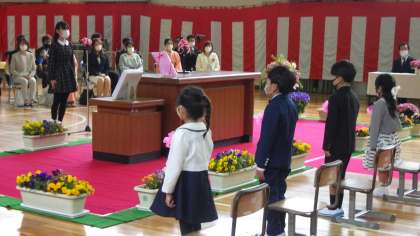 6年生がトーンチャイムを演奏する中、しっかり前を向き、ピカピカの1年生が入場してきます。返事も大きな声でできました。式のあいだ中、ぴんと背筋を伸ばし、話が聞けました。とてもしっかりした新1年生です。1番目の校訓、「強い子」になれそうです。