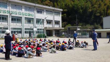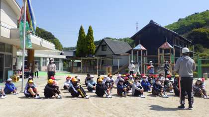 地震から火事が発生したことを想定して、避難訓練を行いました。子どもたちは、新しい教室からの避難経路と避難の約束を確認して素早く避難することができました。また、今回は土砂災害も想定して、こども園に移動をしました。すべての訓練終了後に消防署の方に避難するときのアドバイスをいただきました。