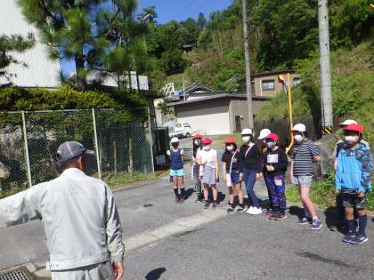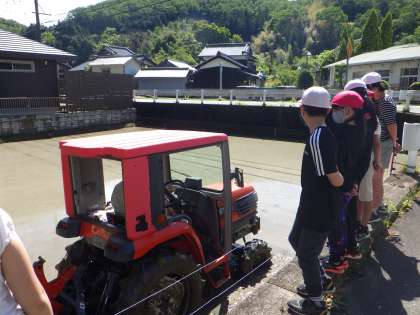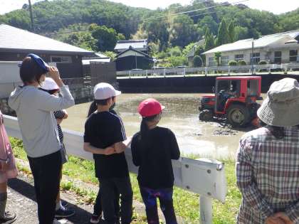 代掻きの見学をしました。講師の敏朗さんが機械で肥料をまき、トラクターで田んぼを田植えができる状態にしてくださいました。10日には、5年生が中心となり、全校で田植えをします。がんばれ!5年生!