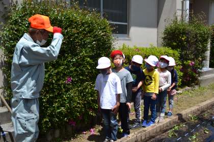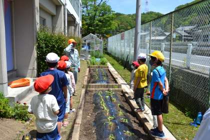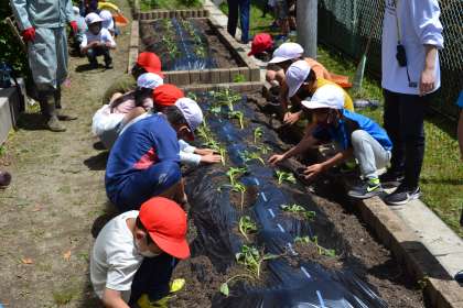 1・2年生の生活科で、サツマイモの苗さしをしました。校内整備員の幸夫さんのお話を真剣に聞いて、ていねいにサツマイモの苗をさしていきました。作業が終わったあとには、幸夫さんにきちんとお礼を言うこともできました。これから、1・2年生みんなでお世話をしていきます。秋の収穫が今から楽しみです。