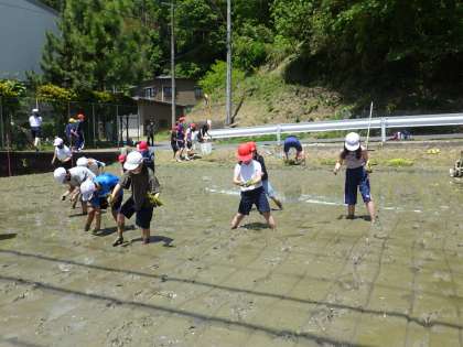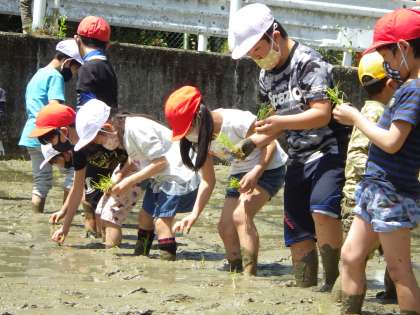 昨年度は、実施することができませんでしたが、今年度は全校で実施することができました。田植えの前に、5年生が田んぼに線を引いて準備をしました。そして、敏朗さんに田植えのポイントを教えていただき、全校で植えました。
