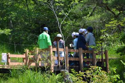 6年生は、5月の湿地学習会で、湿地講師の中根先生から湿地の植物についてたくさんのことを教えていただきました。湿地学習後、下学年に紹介したい植物について、インターネットで詳しく調べました。今回は、調べた植物のその後の様子を確かめ、下学年に紹介するときに使う写真を撮りました。とても暑い日になりましたが、6年生は広い湿地内を行き来して、現在の植物の様子を一生懸命調べました。トウカイコモウセンゴケの湿地には、モウセンゴケの白い花やトウカイコモウセンゴケのピンクの花が可憐に咲き、シラタマホシクサの湿地には、ササユリ、カキランが満開でした。ササユリは、シラタマホシクサの湿地だけで、58株確認できました。中には、顔を近づけて、ササユリの香りを確かめる子もいました。もう少しすると、サギソウも咲き始めると思います。しばらくは、湿地の花を楽しむことができそうです。