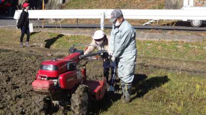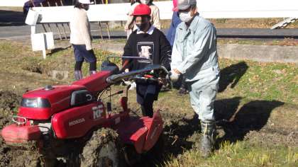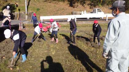 収穫が終わり、本年度の米作りも一区切りです。今日は、来年度の米作りのために備中くわを使ったり、機械を使ったりして田おこしをしました。来年もおいしいお米が収穫できるといいですね。
