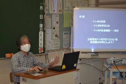 4月27日(水)、自然再生NPO「カエルの分校」代表の大内秀之さんを講師にお迎えして、トンボ学習会を行いました。4年生は今年度、総合的な学習の時間に、トンボの楽園を目指して、ビオトープの生き物調査、整備活動などに取り組んでいきます。今回は、トンボの生態やトンボが必要としている環境について、たくさんの写真を見せてもらいながら、丁寧に話をしていただきました。4年生の子どもたちはみんな真剣に話を聞き、トンボに興味をもったようです。来週は、大内さんといっしょにビオトープでトンボの調査をします。どんなトンボが見つかるかとても楽しみです。